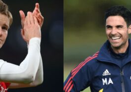 in imikino Kapiteni wa Arsenal Martin Odegaard yihandagaje atuka umutoza we Mikel Arteta aramwandagaza