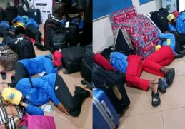 in imikino Abakinnyi b’ikipe y’igihugu ya Repubulika Iharanira Demokarasi ya Congo, baraye hasi kuri sima mu kibuga cy’indege cya Accra muri Ghana – AMAFOTO