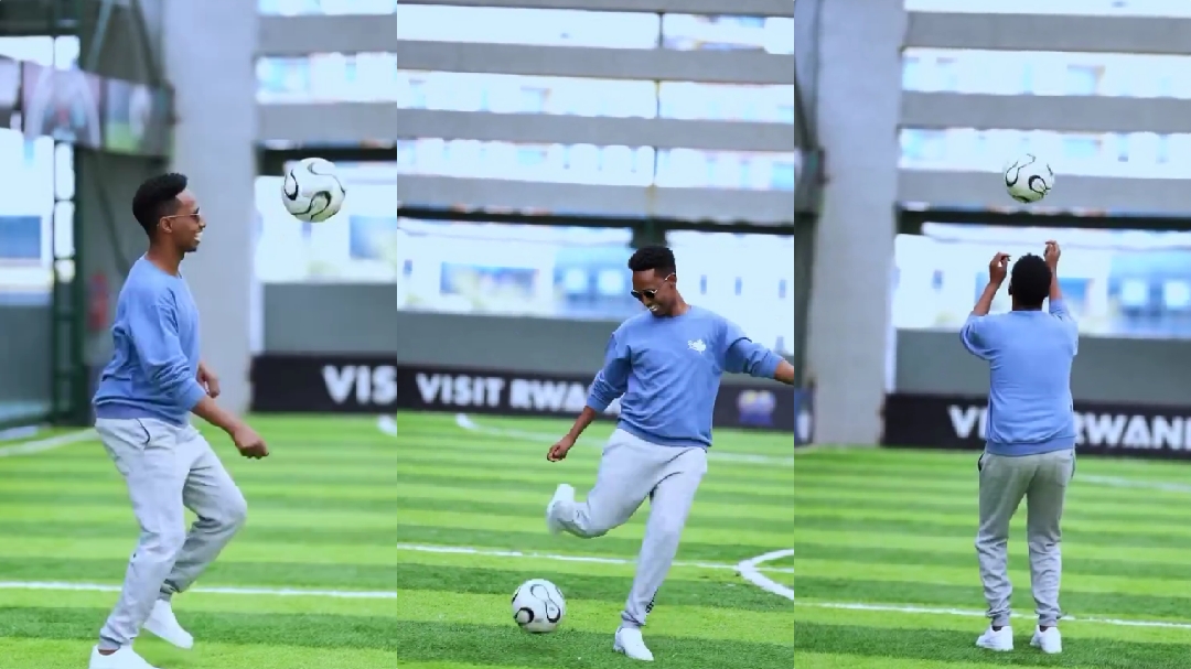 in Imyidagaduro Umupira awutegeka uko ashaka! Umuramyi Mbonyi Israel yagaragaje impano n’ubuhanga afite bidasanzwe mu guconga ruhago abantu baratangara – VIDEWO
