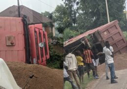 in Mu Rwanda Habaye impanuka iteye ubwoba y’imodoka yo mu bwoko bwa HOWO yaguye munsi y’umuhanda ihetse umucanga -Amafoto