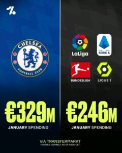 Ikipe ya Chelsea iyoborwa na Todd Boehly , umuherwe w’umwongereza yaciye impaka mu igura n’igurishwa ry’abakinnyi muri uku kwezi kwa mbere. Todd Boehly na Chelsea ye basohoye akavagari k’amafaranga kurusha andi ma Shampiyona ane akomeye ku mugabane w’Iburayi ubwo ni ukuvuga LaLiga ya Espagne, SerieA y’u Butariyani , Bundesliga y’ u Budage na Ligue1 y’u Bufaransa.