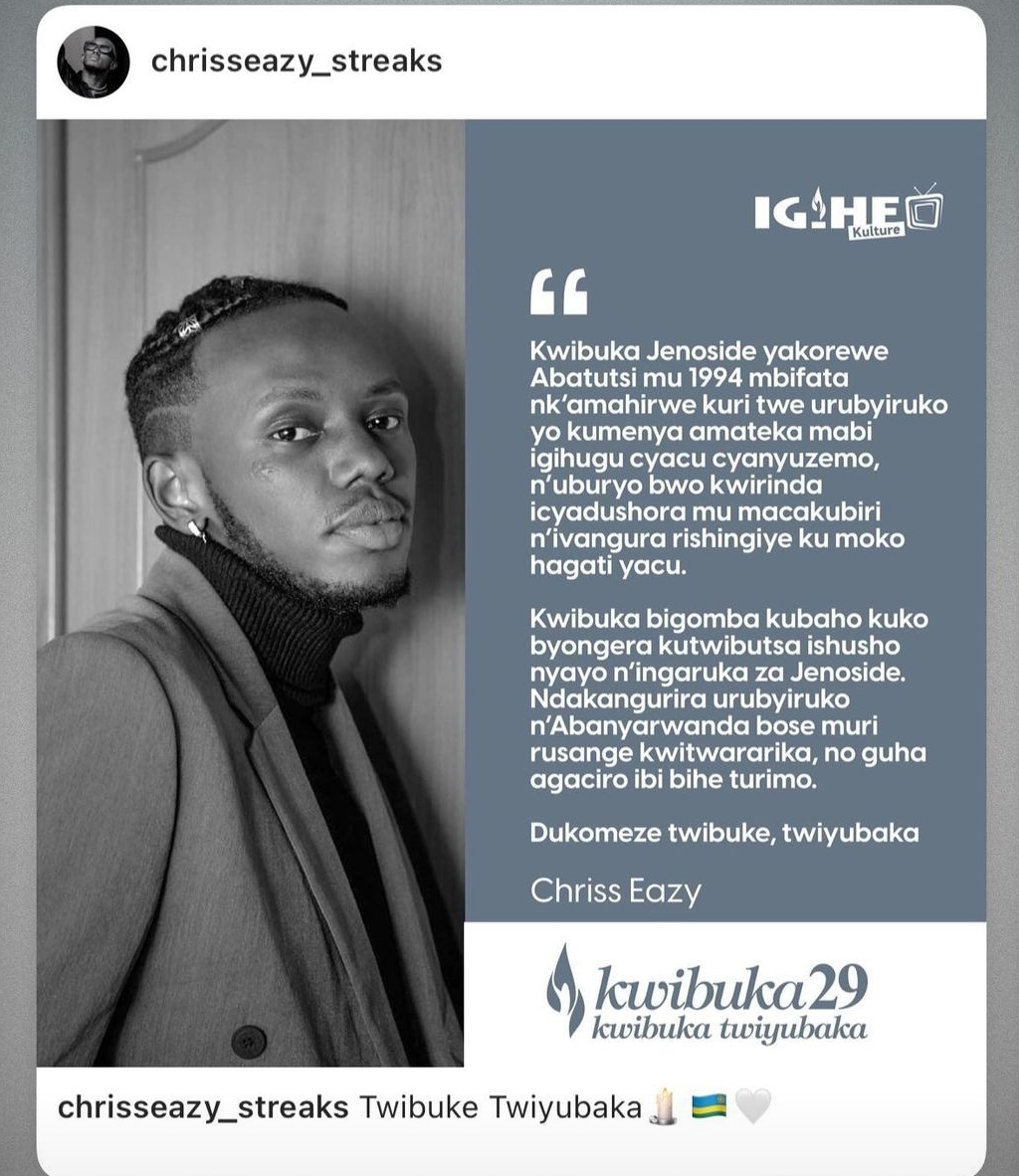 Ubu n’ubutumwa Chriss Eazy yageneye urubyiruko arugira inama yo guha agaciro amateka mabi yaranze igihugu ndetse no kwirinda amacakubiri uyu muhanzi yasoje agira ati:” Twibuke Twiyubaka”.