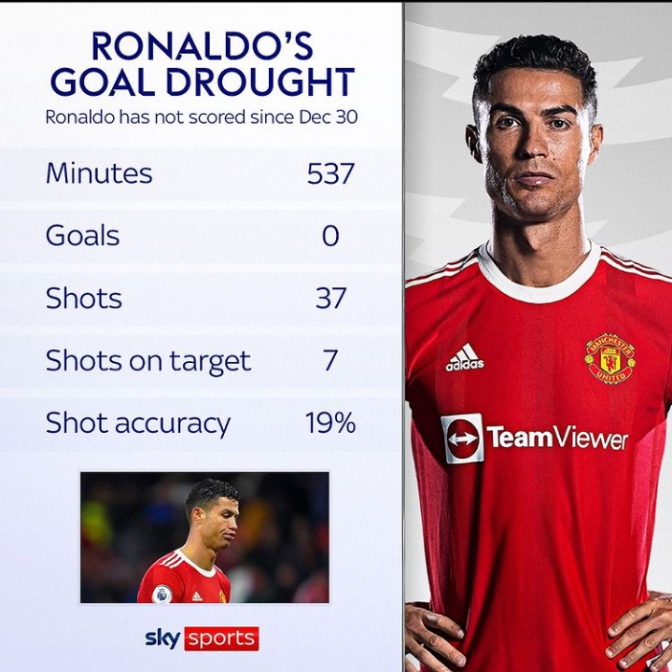 Uyu mukinnyi w’igihangange Christiano Ronaldo akaba akomeje kudahirwa no kubona intsinzi mu mikino itandatu, ibi bikaba bitaraherukaga kubaho ko yamara imikino itandatu ataratsinda kuko byaherukaga mu mwaka wa 2008-2009, aka gahigo kabi akaba agaciye nyuma y’uko umukino wa Southampton atabashije kugira icyo akora.