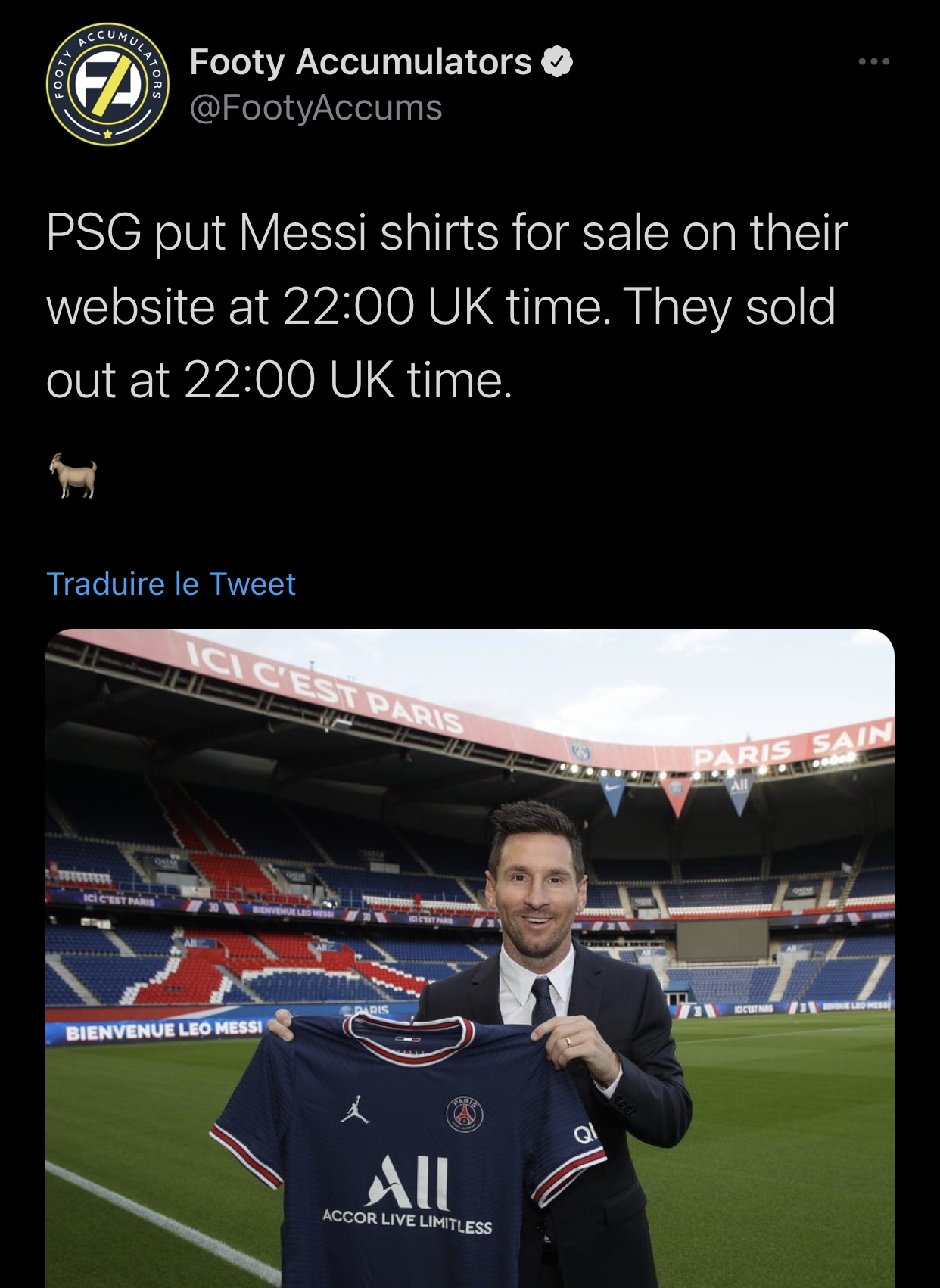 Mu nkuru twari twababwiye ko imyenda Messi azambara muri PSG igura asaga ibihumbi ijana y’U Rwanda. Amakuru dukesha Footy accumulators atubwira ko PSG ikimara gushyira hanze igiciro cy’iyi myenda Messi azambara, iyi myenda yahise igurwa yose irashira nta munota n’umwe ushize.