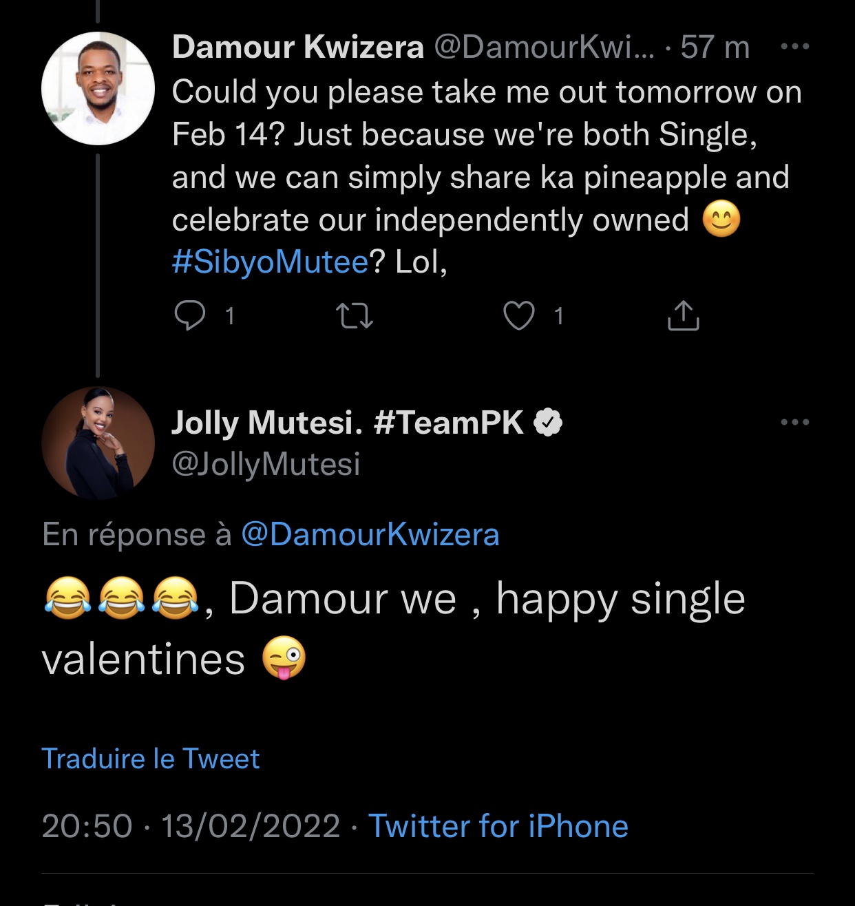 Nyuma yuko Mutesi Jolly ashyize hanze iyi foto, umwe mu bafana be bamukurikira kuri Twitter witwa Damour Kwizera yahise amubwira ati « Could you please take me out tomorrow on Feb 14? Just because we’re both Single, and we can simply share ka pineapple and celebrate our independently owned 😊 #SibyoMutee? Lol,». Amaze kubona aya magambo ya Kwizera, Mutesi Jolly yamusubije agira ati « 😂😂😂, Damour we , happy single valentines 😜».
