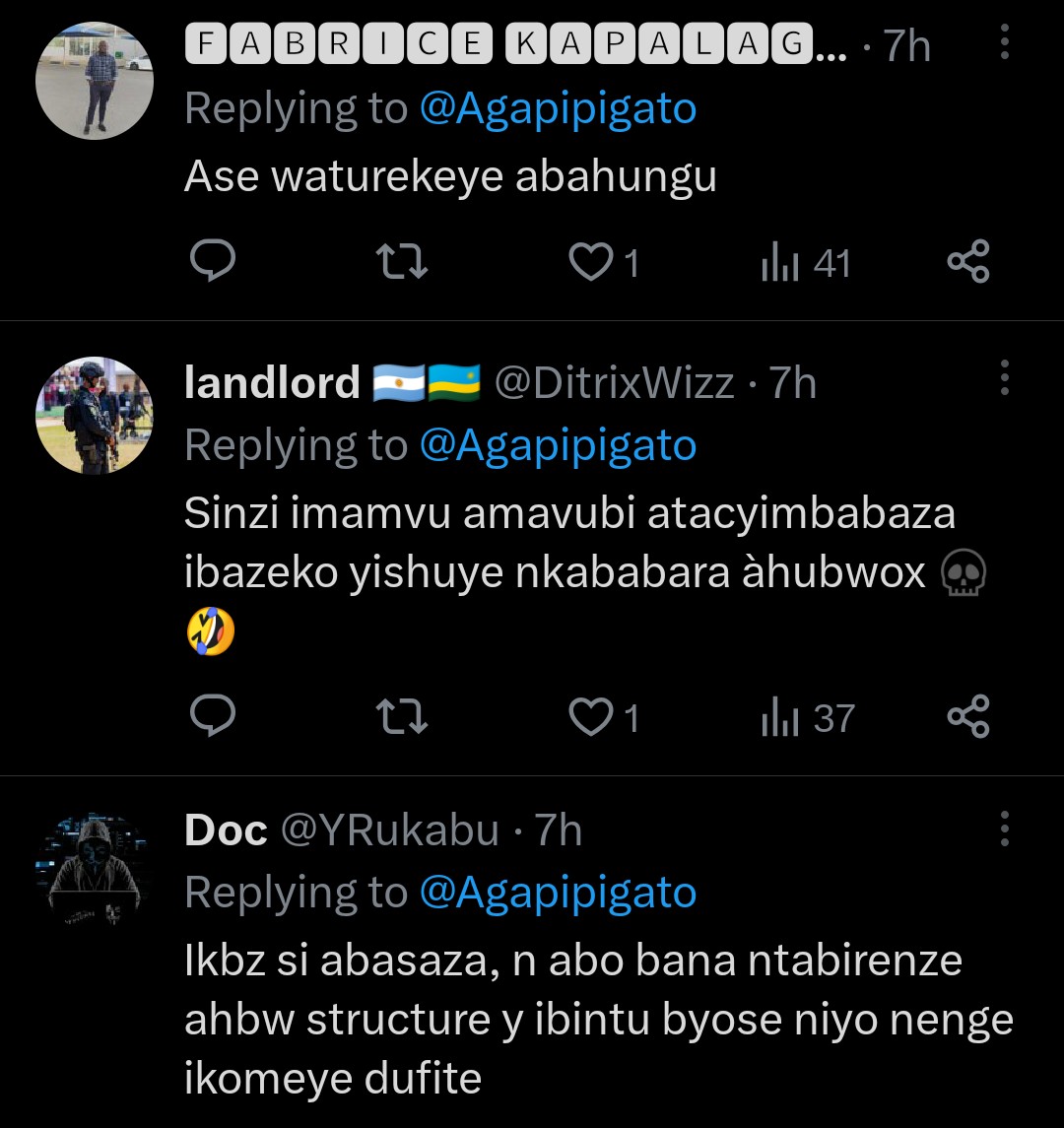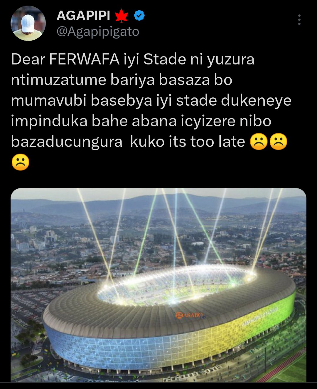 Yagize ati: “Dear FERWAFA iyi Stade ni yuzura ntimuzatume bariya basaza bo mumavubi basebya iyi stade dukeneye impinduka bahe abana icyizere nibo bazaducungura kuko its too late.”