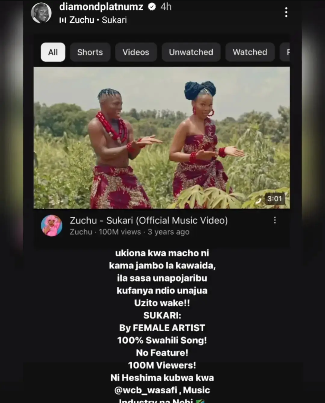 Diamond Platnumz yashimye umuhanzi akaba n’umukunzi we Zuchu nyuma gukora amateka yo kuba umuhanzi wa mbere w’umugore ukomoka muri Africa y’iburasirazuba ufite indirimbo imaze kurebwa n’abagera kuri miliyoni 100 kuri youtube, ariko itari collabo.