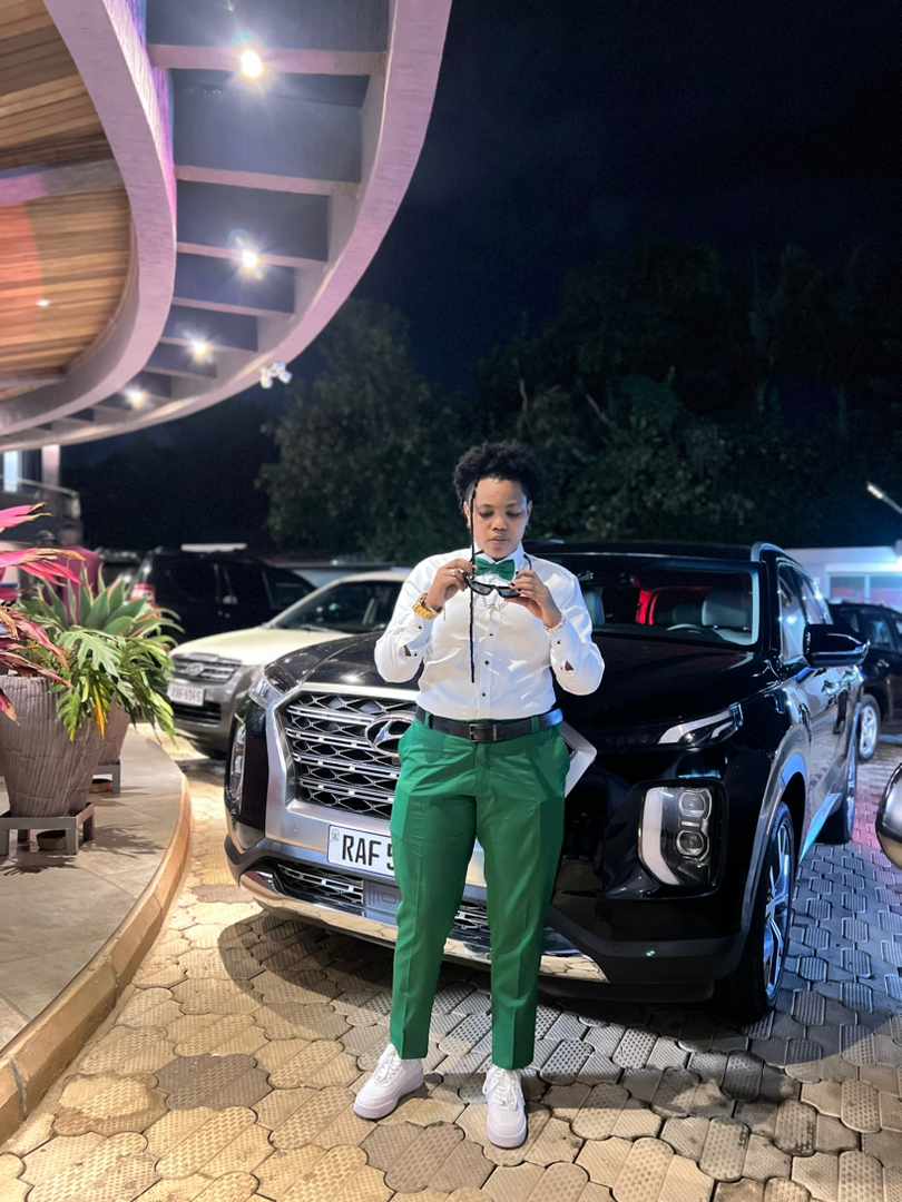 Dj Brianne ahagaze imbere y’imodoka y’umuturika yatangariwe na benshi kubera imyambarire yagaragaye yambaye.