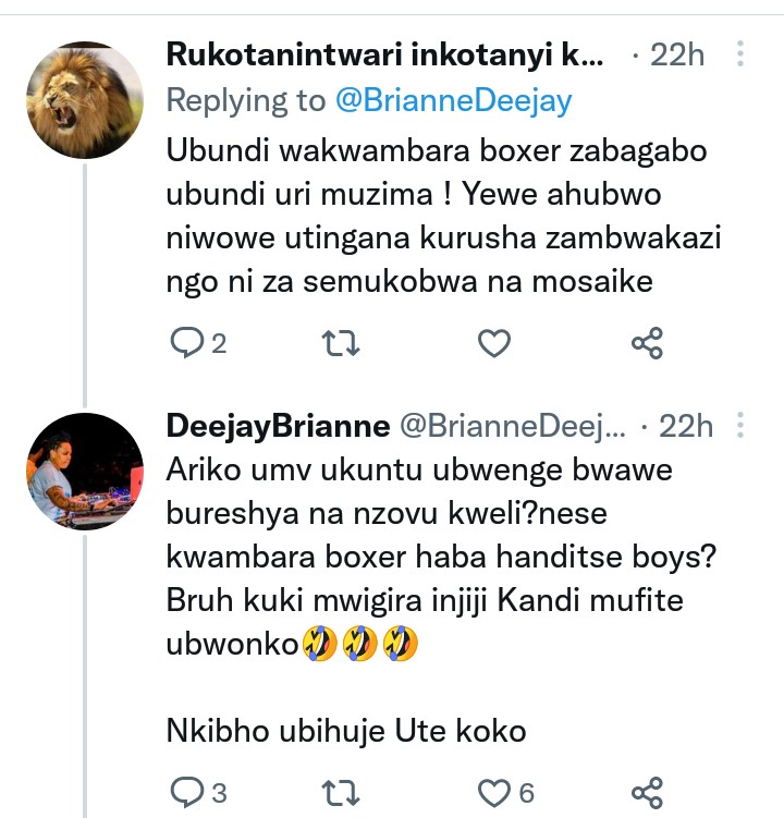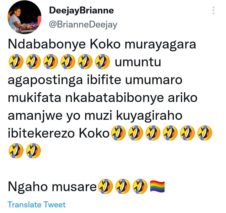 Mu magambo ye yagize ati “Ndababonye Koko murayagara umuntu agapostinga ibifite umumaro mukifata nkabatabibonye ariko amanjwe yo muzi kuyagiraho ibitekerezo Koko, ngaho musare 🏳️🌈 .”