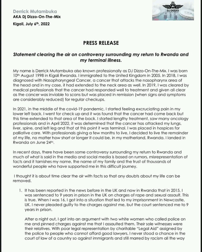 Nyuma y’ibyo byose byagiye bimuvugwaho Dj Dizzo yavuze yafunzwe ndetse anashimangira ko afite cancer ibintu abantu bahakanaga, aho bavugaga ko ari ibinyoma.