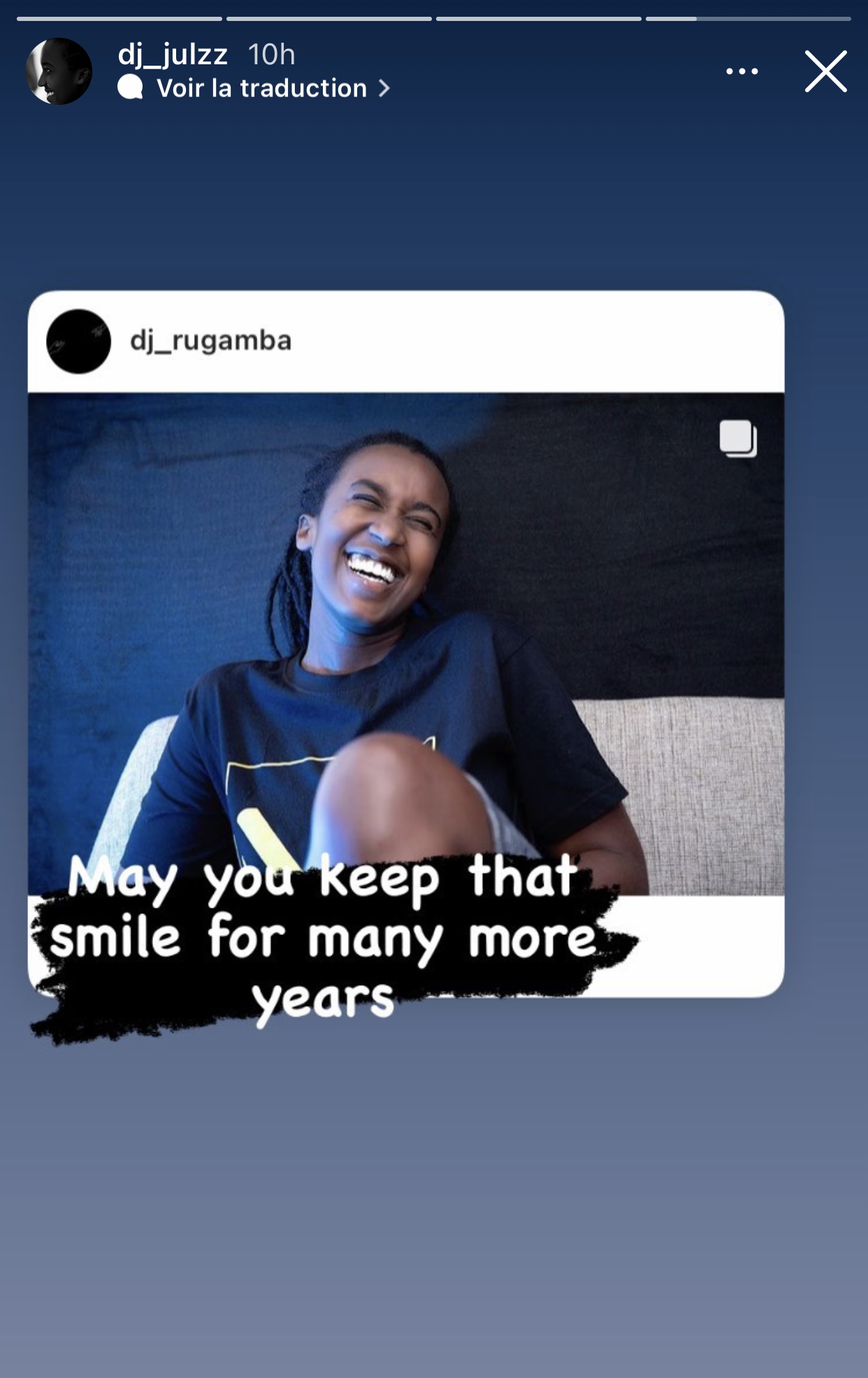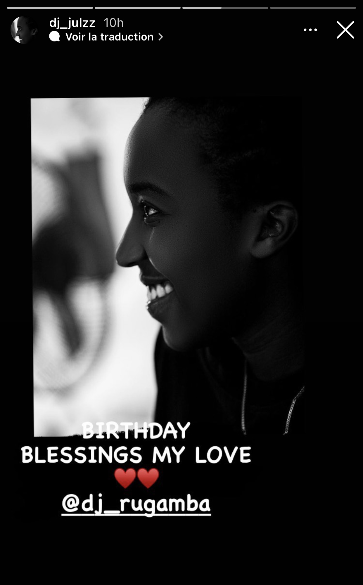 Dj Julzz, umukunzi wa Dj Rugamba, abinyujije kuri story ya instagram ye yashyize hanze ifoto ya Dj Rugamba maze ayiherekesha amagambo agira ati « birthday blessings my love ❤️❤️ @dj_rugamba», yunzemo ashyira hanze indi foto igaragaza Dj Rugamba arimo guseka maze ayiherekesha amagambo agira ati « May you keep that smile for many more years ».