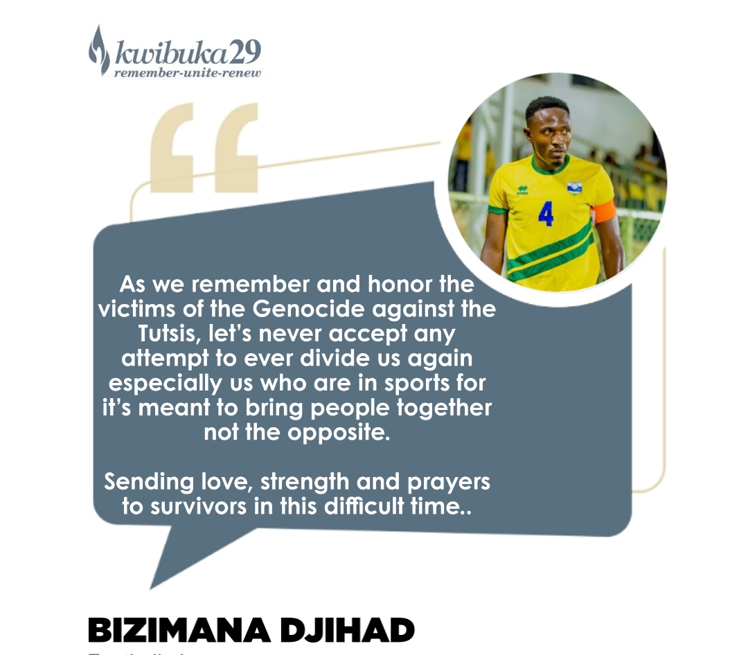 Djihad Bizimana yagize ati ” Mu gihe Twibuka tukanunamira inzirakarengana zishwe muri Jenoside yakorewe Abatutsi, leka ntituzemera ikindi cyadutandukanya, cyane cyane twe turi muri siporo reka dutume ihuza abantu nta kubatandukanya.