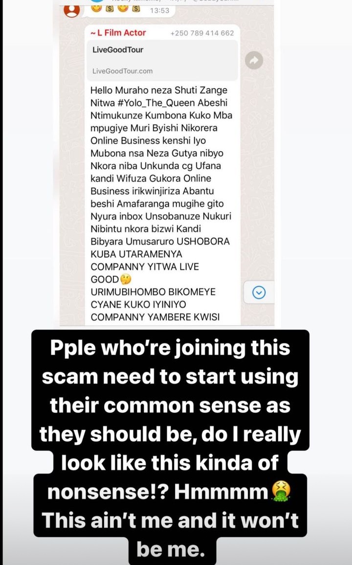 Abinyujije ku rukuta rwe rwa Instagram Yolo The Queen yavuze ko nta muntu n’umwe yigeze arangira online Business nk’uko bigaragara ko hari abakomeje kwitwaza izina n’imite bye bagashaka gutuburira abanyarwanda bababeshya ko hari Business za Online zinjiza agatubutse kandi nyamara ari abashaka kubamara ho utwabo.