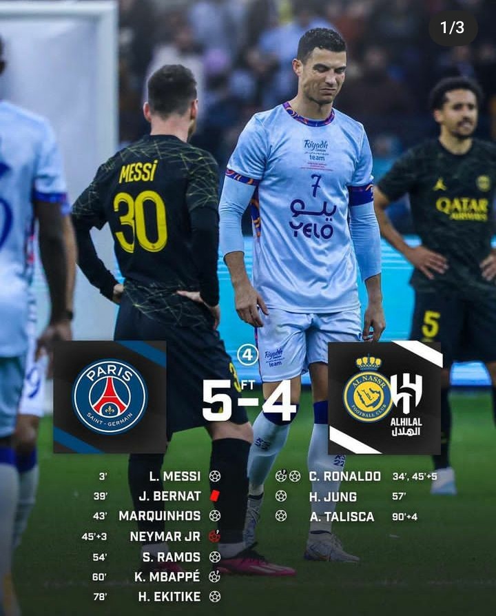 Uyu mukino usojwe ari ibitego 5 bya PSG kuri 4 bya Riyadh XI, amakipe yombi yasoje igice cya mbere anganya ibitego 2:2 , ku munota wa 3′ gusa nibwo L.Messi yafunguye amazamu, ku munota wa 36′ kizigenza CR7 yishyuye iki gitego kuri penalty , ku munota wa 43′ Marquinhos yatsindiye PSG igitego cya 2 bidatinze CR7 yakishyuye nacyo ku munota wa 6 winyongera.