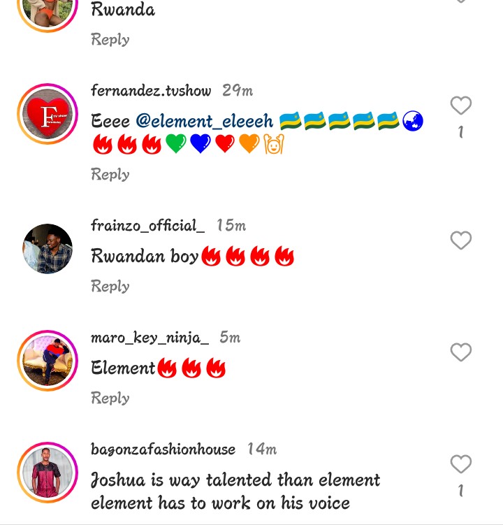 Ku mbuga nkoranyambaga bakomeje kugereranya umuhanzi w’umunyarwanda Element n’umuhanzi wo muri Uganda Joshua, nyuma yo kumva imiririmbire yabo bose.