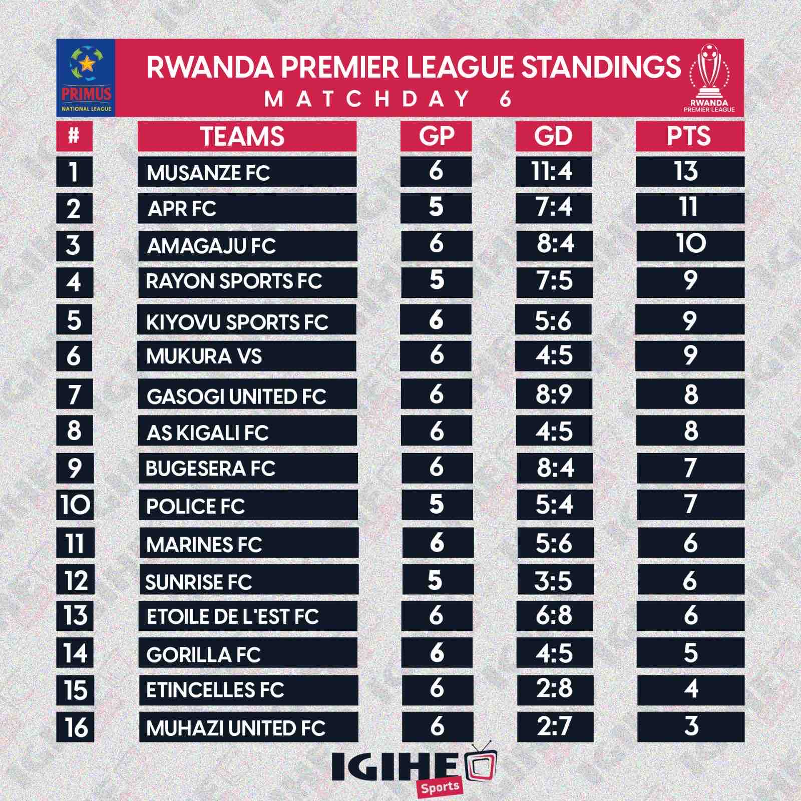 Urutonde rwa Shampiyona y’u Rwanda nyuma y’imikino y’Umunsi wayo wa Gatandatu.
