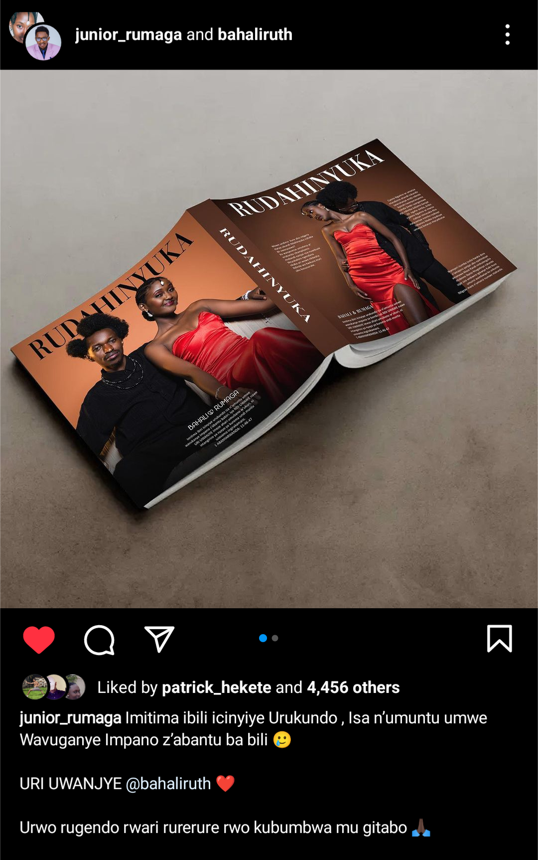 Abinyujije kurukuta rwe rwa Instagram yashyizeho igitabo gishya cy’imitoma kitiho ifoto ye na Bahali Ruth gusa yarengejeho amagambo benshi batari gusobanukirwa.