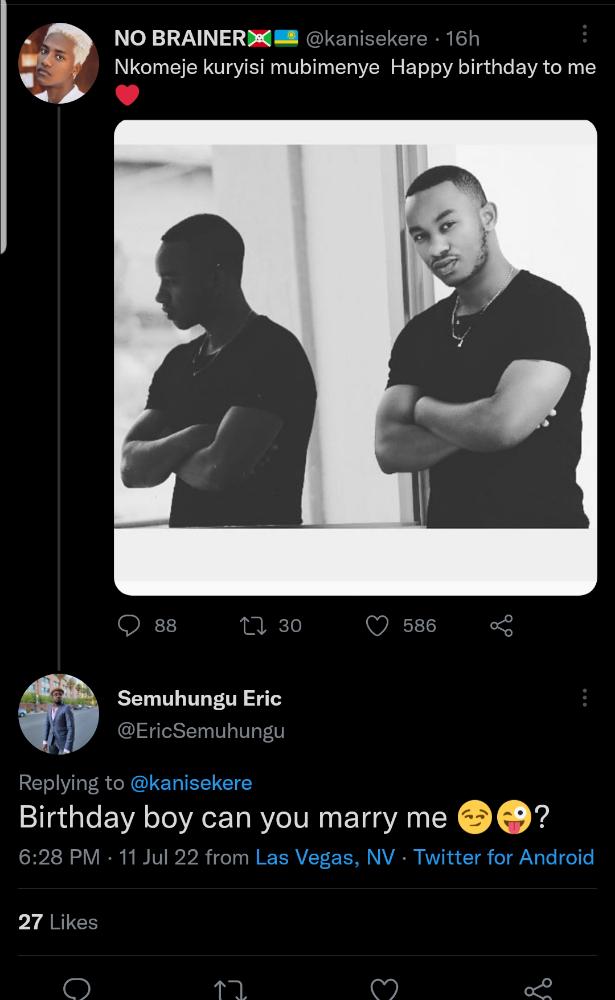 Ku munsi w’ejo hashize nibwo umusore uzwi ku izina rya No Brainer kuri Twitter ye yagize isabukuru maze Semuhungu aboneraho amusaba ko yamubera umufasha.
