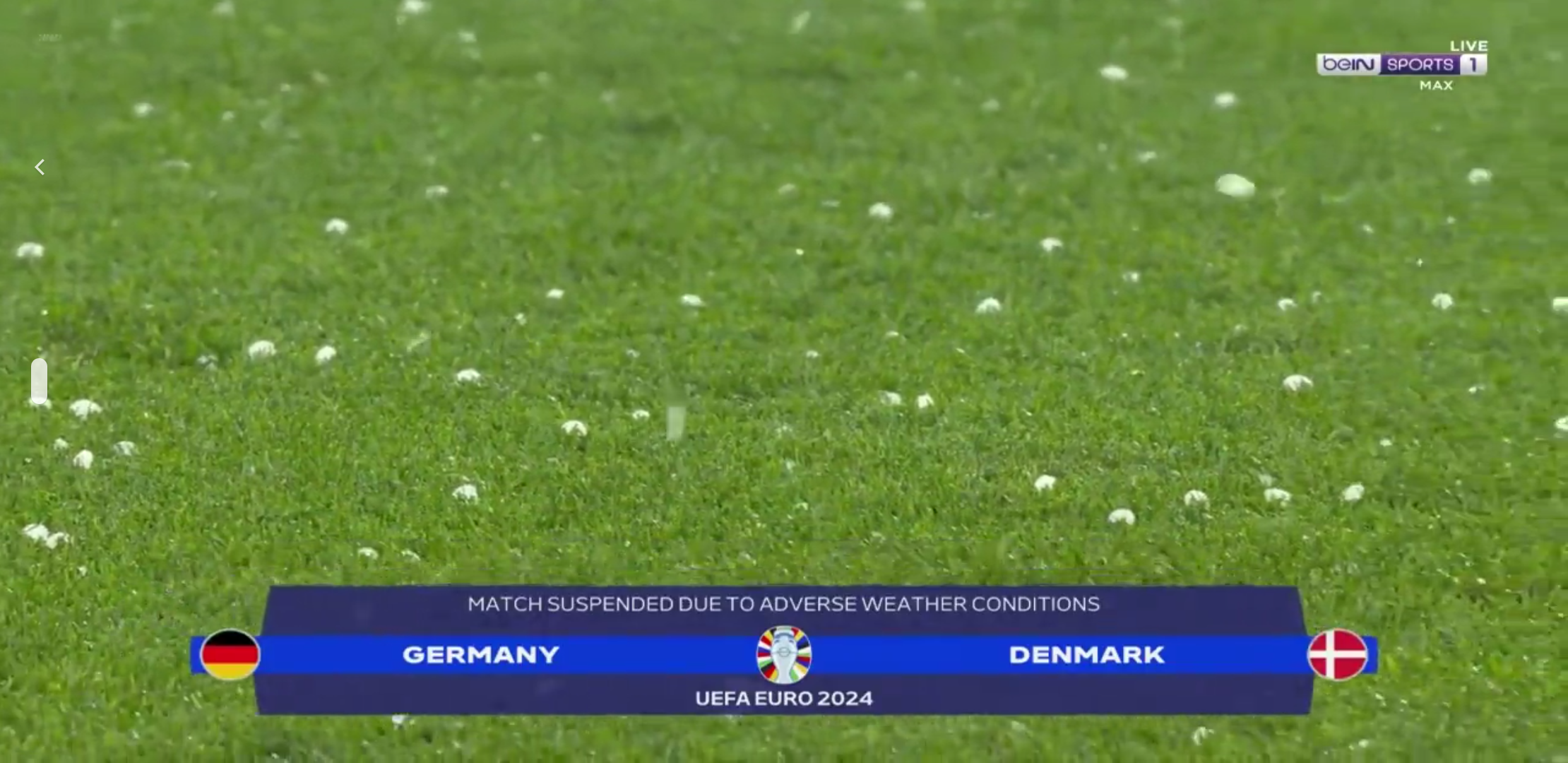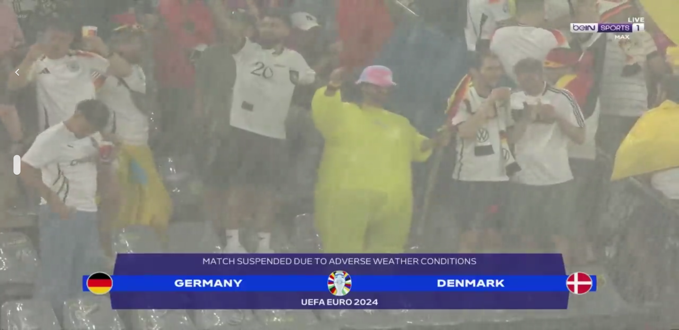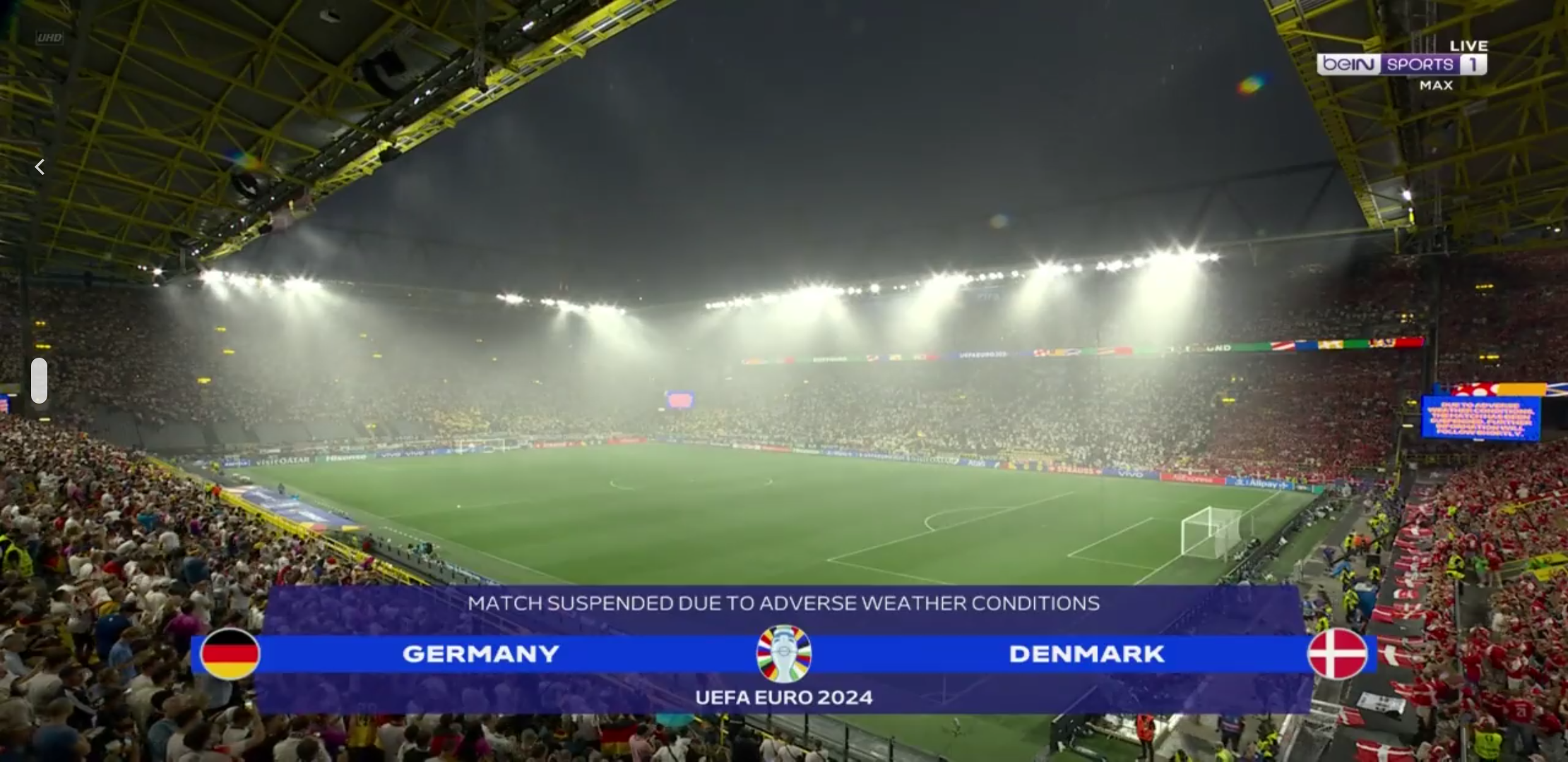 Mu gihugu cy’Ubudage ahari kubera imikino y’igikombe cy’ibihugu by’iburayi Euro imvura imeze nabi cyane kuburyo bigeze aho umukino wahuzaga ikipe y’igihugu y’Ubudage na Denmark uhagarara utarangiye.