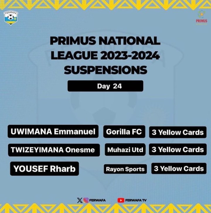Mu bakinnyi 3 batemerewe gukina umunsi wa 24 wa Shampiyona y’umupira w’amaguru mu Rwanda kubera amakarita 3 y’umuhondo, harimo na Youssef Rharb wa Rayon Sports.