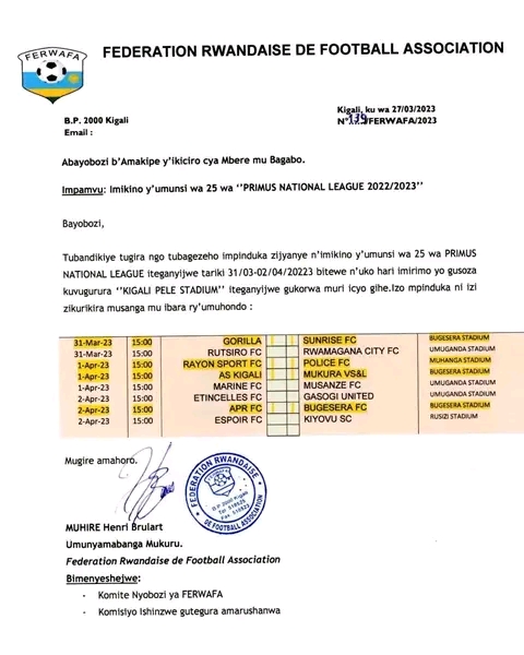Ishyirahamwe ry’umupira w’amaguru mu Rwanda (FERWAFA) ryandikiye amakipe yose 16 akina shampiyona y’ikiciro cya mbere riyamenyesha aho azakinira imikino y’umunsi wa 25.
