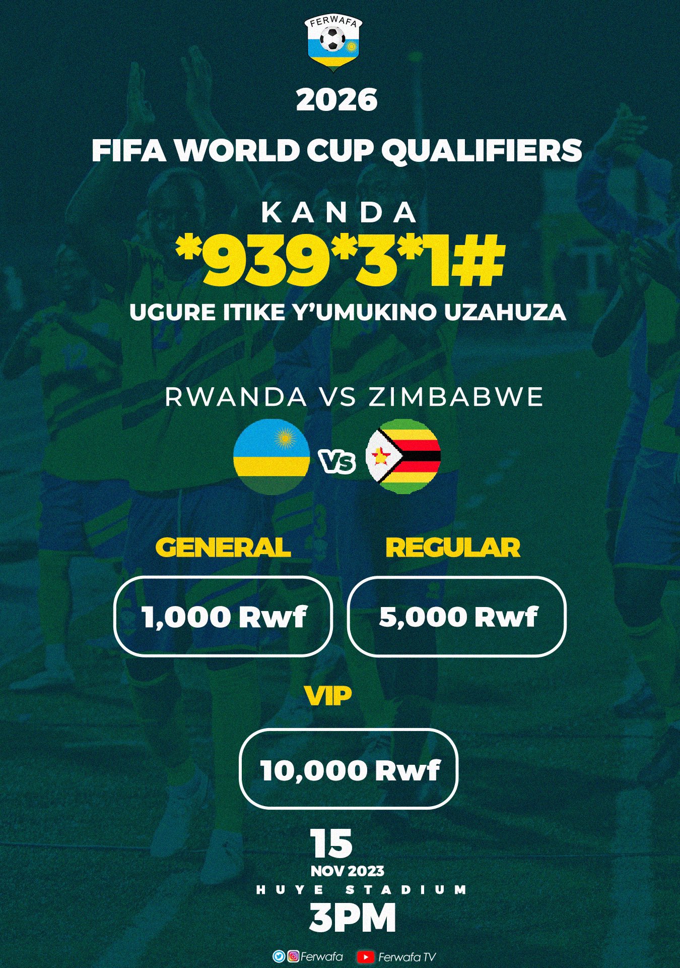 Ishyirahamwe ry’Umupira w’Amaguru mu Rwanda, FERWAFA, ryatangaje ibiciro byo kuzareba Umukino na Zimbabwe mu ijonjora ryo gushaka itike y’igikombe cy’Isi.