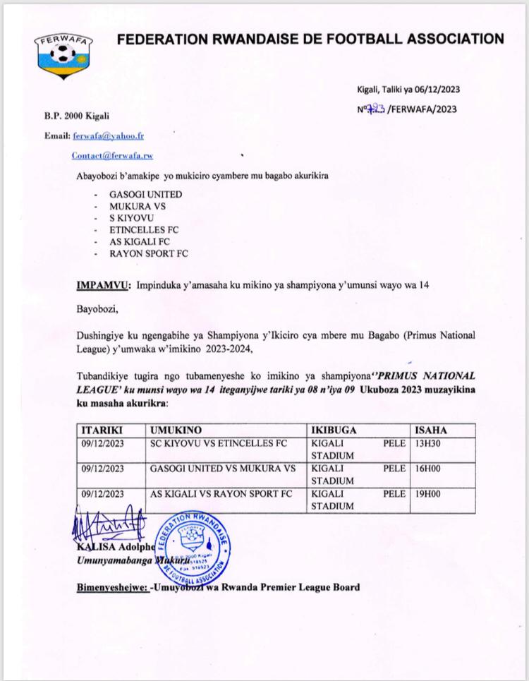 Ishyirahamwe ry’umupira w’amaguru mu Rwanda FERWAFA ryatangaje ko hari umwe mu mikino y’umunsi wa 14 yimuriwe amasaha.