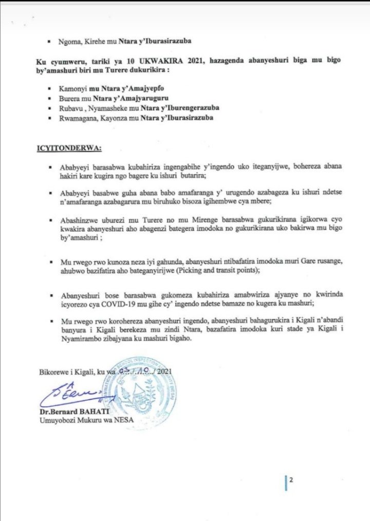 Mu masaha make ashize nibwo NESA imaze gushyira ahagaragara itangazo rijyanye n’ingendo  z’abanyeshuri biga bacumbikirwa mu mashuri yisumbuye iteye. Iryo tangazo ni iri rikurikira: