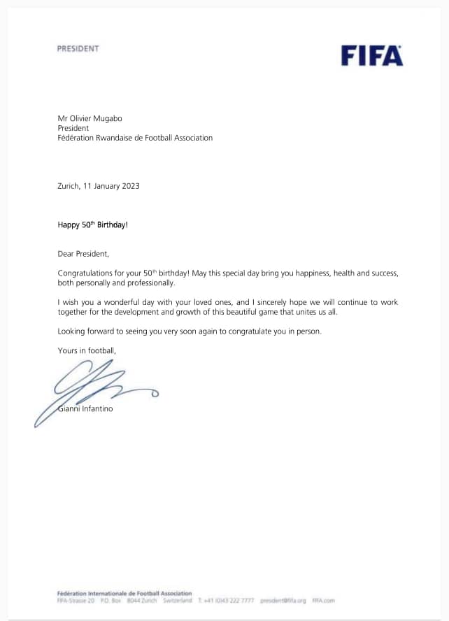 Uyu munsi Infantino uyobora FIFA yageneye ubutumwa bwihariye bwifuriza isabukuru nziza y’imyaka 50 y’amavuko Nizeyimana Mugabo Olivier uyobora FERWAFA yagize.