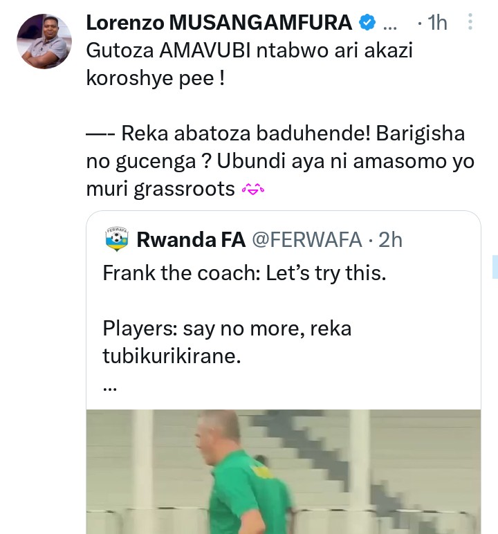Lorenzo Christian wa RBA, nyuma yo kubona aya mashusho yagize ati “Gutoza AMAVUBI ntabwo ari akazi koroshye pee! Reka abatoza baduhende! Barigisha no gucenga? Ubundi aya ni amasomo yo muri grassroots.”