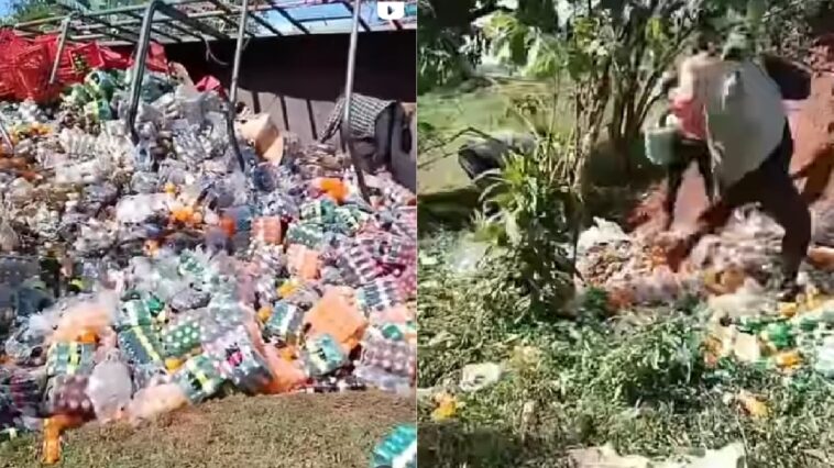 Nk’uko bigaragara mu mashusho akomeje gusakara ku mbuga nkoranyambaga zigiye zitandukanye, imodoka yari itwaye ibyo kunywa yakoze impanuka ni uko maze abaturage baza kwitoraguragurira ibyamenetse.