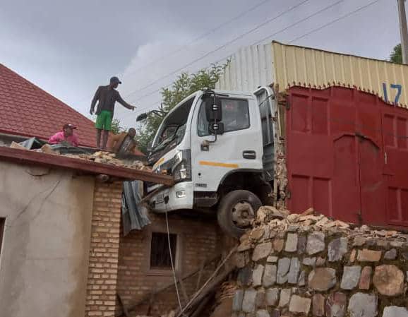 Ku mbuga nkoranyambaga hakomeje kuzenguruka ifoto igaragaza imodoka yo mu bwoko bwa Fuso yagonze igipangu habura gato ngo igwe hejuru y’inzu.