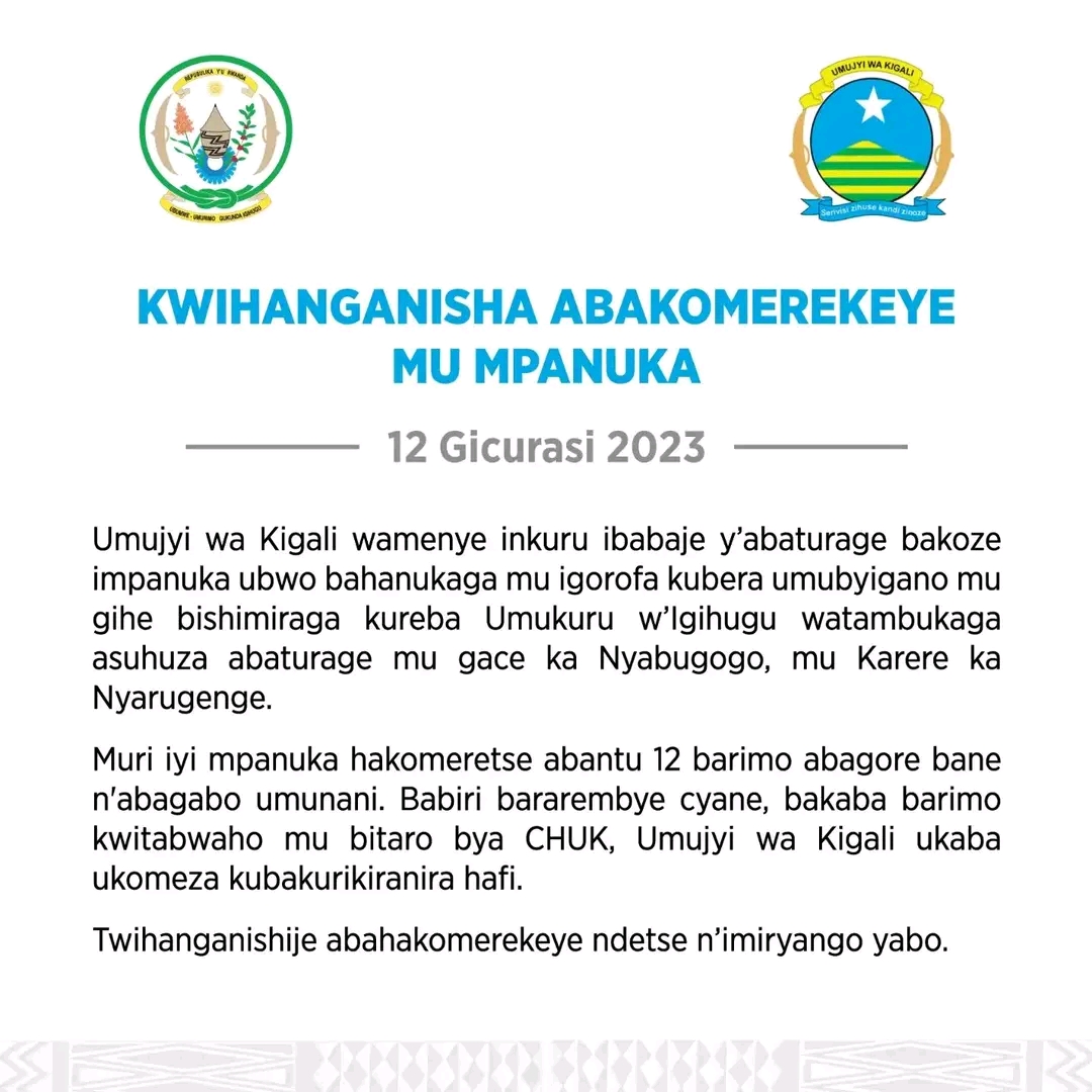Mu itangazo bawatangaje ko abantu 12 bakomerekeye mu mpanuka yabereye i Nyabugogo ubwo abaturage bishimiraga Umukuru w’Igihugu wahanyuze abasuhuza.