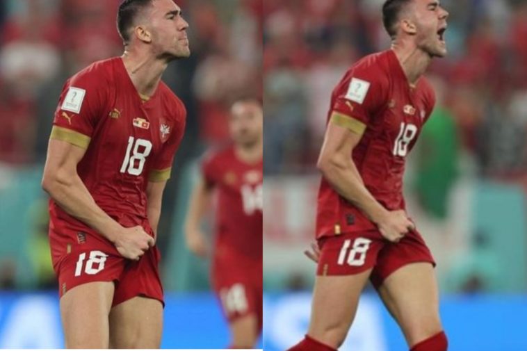 Hamenyekanye Impamvu itangaje yatumye rutahizamu wa Serbia yishimira igitego yatsinze afashe mu bugabo bwe