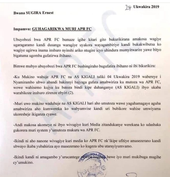 Mu mwaka wa 2019 tariki ya 24 Ukwakira nibwo ikipe ya APR FC yashyize hanze itangazo rivuga ko batandukanye na rutahizamu wabo Sugira Ernste.