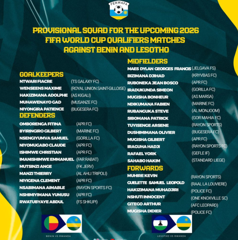 Umutoza w’Ikipe y’Igihugu “Amavubi”, Frank Spittler Torsten, yashyize ahagaragara urutonde rw’agateganyo rw’abakinnyi 37 bazitabira umwiherero wo kwitegura imikino ibiri y’umunsi wa Gatatu n’uwa kane mu gushaka itike y’igikombe cy’Isi cya 2026 u Rwanda ruzasuramo Bénin na Lesotho muri Kamena uyu mwaka.
