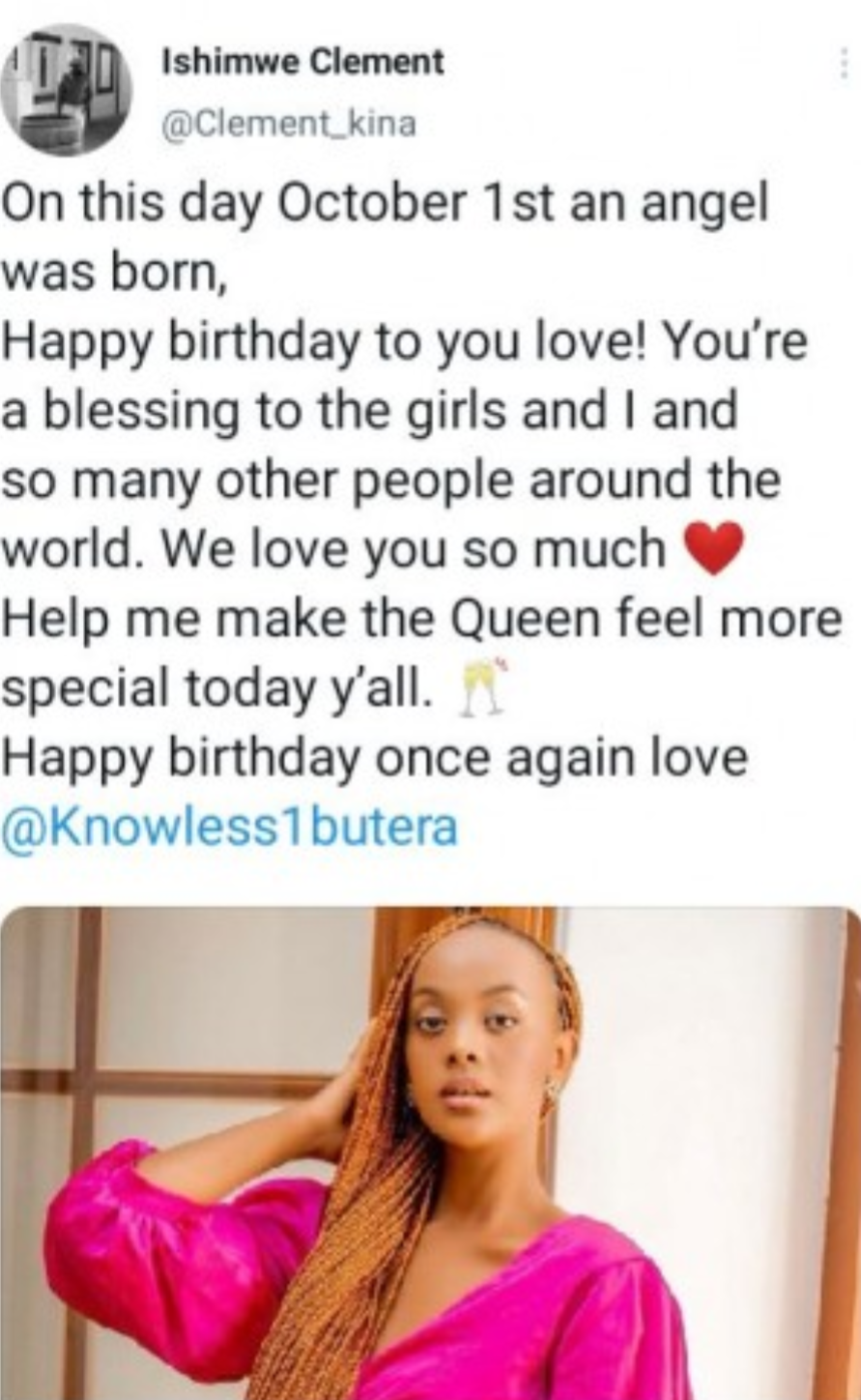 Ishimwe Clement usanzwe ari nyiri Label yitwa “Kina Music ” uzwi mu gutunganya umuziki yatomoye imitoma idasanzwe Umugore we Butera Knowless kuri uyu munsi we w’amavuko.