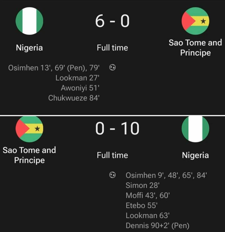 Umukino wambere warangiye ikipe ya Nigeria itsinze ibitego 6 kubusa, umukino wa kabiri urangira itsinze ibitego 10 ku busa. Osimhen niwe mukinnyi watsinze byinshi, mu mukino wambere yatsinze 3 mu mukino wa kabiri arsinda 4.