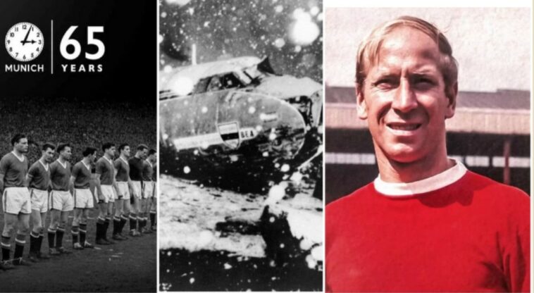 Sir Bobby Charlton wakinaga mu kibuga hagati ni umwe mu bantu 21 barokotse, kuri ubu akaba akiriho afite imyaka 85.