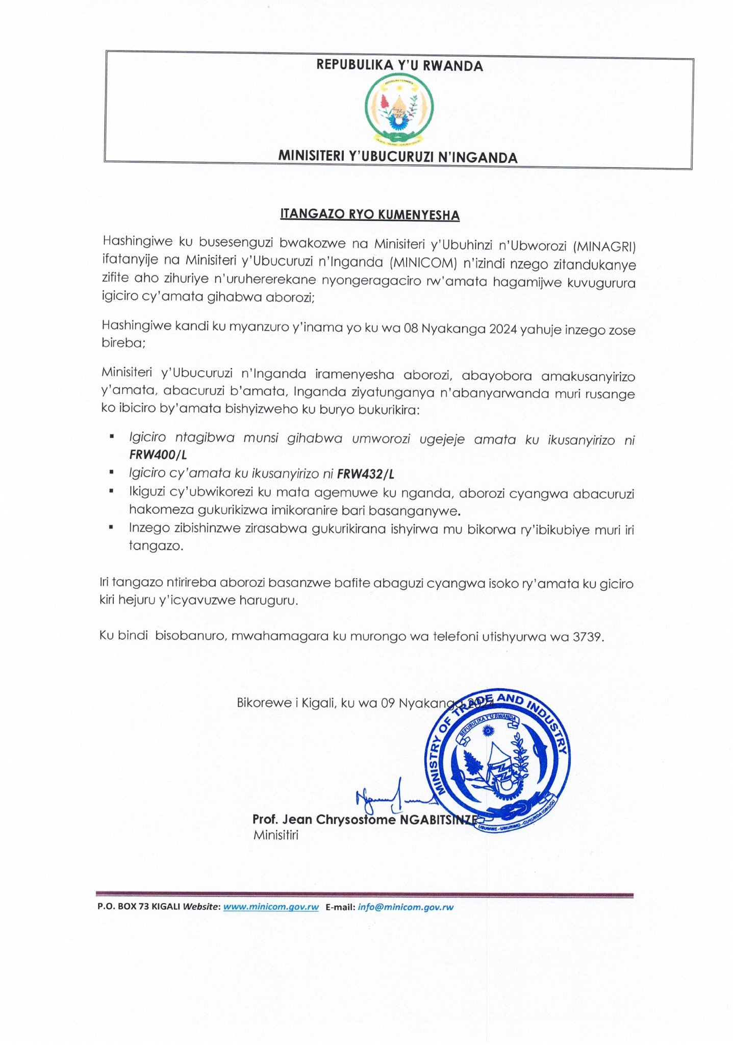 Itangazo rigira riti “ Igiciro ntagibwa munsi gihabwa umworozi ugejeje amata ku ikusanyirizo ni 400 Frw. Igiciro cy’amata ku ikusanyirizo ni 432 Frw kuri litiro. Ikiguzi cy’ubwikorezi ku mata agemuwe ku nganda, aborozi cyangwa abacuruzi hakomeza gukurikizwa imikoranire bari basanganwe.”