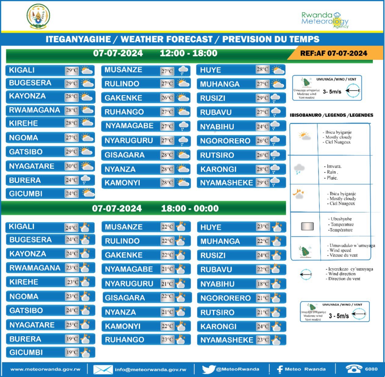 Ikigo cy’Igihugu gishinzwe iteganyagihe cy’u Rwanda ‘Meteo Rwanda’ cyatangaje ko kuri iki Cyumweru tariki ya 07 Nyakanga 2024 hagati ya saa 12:00 na saa 18:00 Hateganyijwe imvura mu ntara y’Uburengerazuba no mu Karere ka Burera, Musanze, Nyaruguru na Nyamagabe.