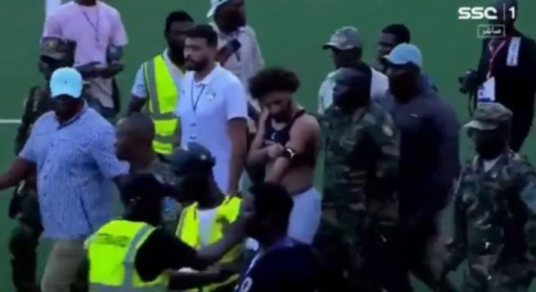 Kugira ngo ajye mu rwambariro abasirikare bahise bajya mu kibuga bamusohora bamurinze ibintu bidasanzwe mu mu mupira w’amaguru.