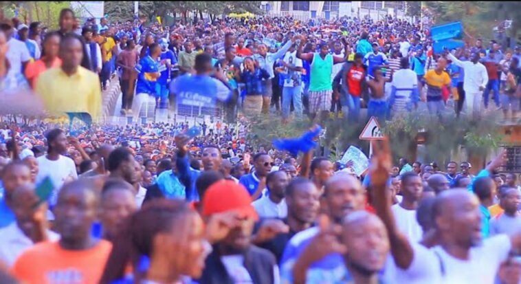 Abafana ba Rayon Sports bari benshi cyane, bafunze umuhanda ubundi bisaba ko imodoka zihagarara bakabanza bagatambuka.