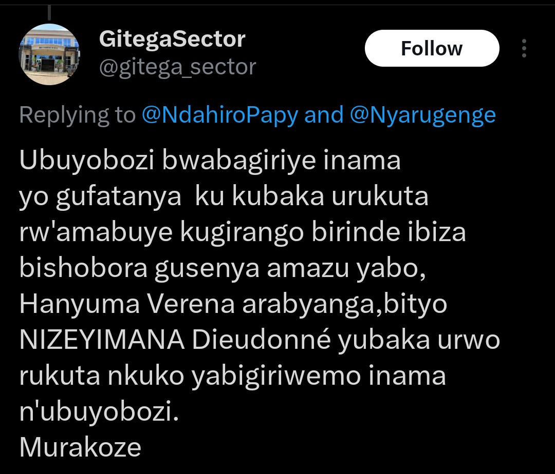 Umurenge wa Gitega wagize icyo ibitangazaho, aho wagize ati: “Ubuyobozi bwabagiriye inama yo gufatanya ku kubaka urukuta rw’amabuye kugirango birinde ibiza bishobora gusenya amazu yabo, Hanyuma Verena arabyanga, bityo NIZEYIMANA Dieudonné yubaka urwo rukuta nkuko yabigiriwemo inama n’ubuyobozi. Murakoze.”