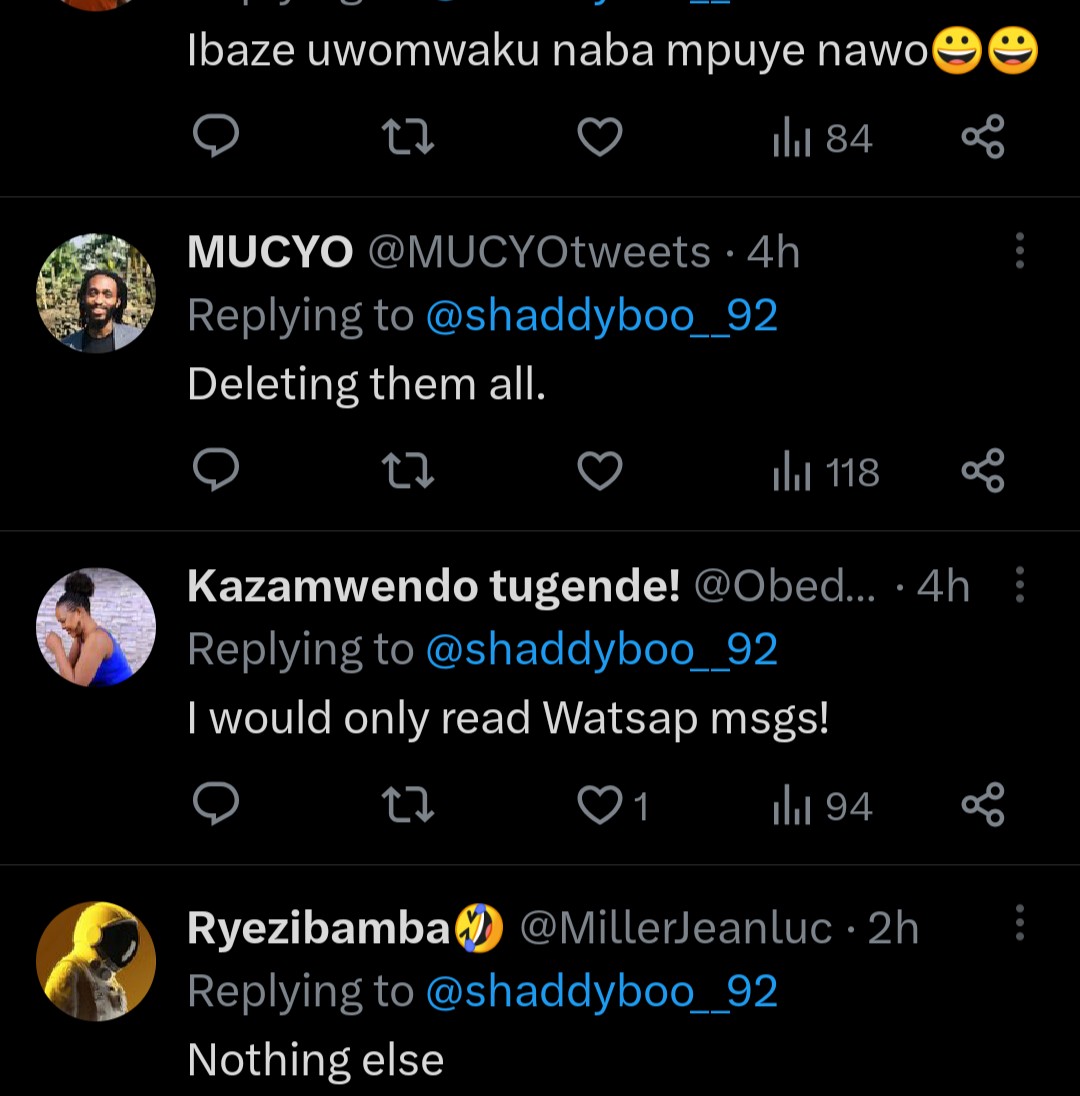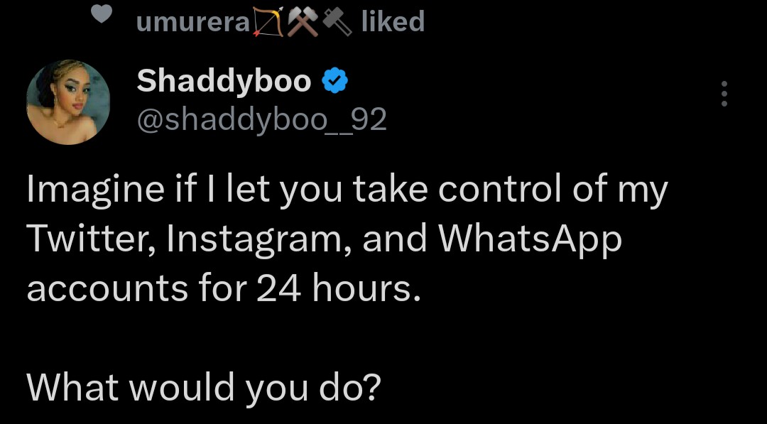 “Ibaze uwomwaku naba mpuye nawo” Shaddy Boo yeretswe ko bamaze kumuhaga nyuma yo kwifata akabaza abantu ikintu bakora baramutse bahawe kugenzura imbuga nkoranyambaga ze mu masaha 24.