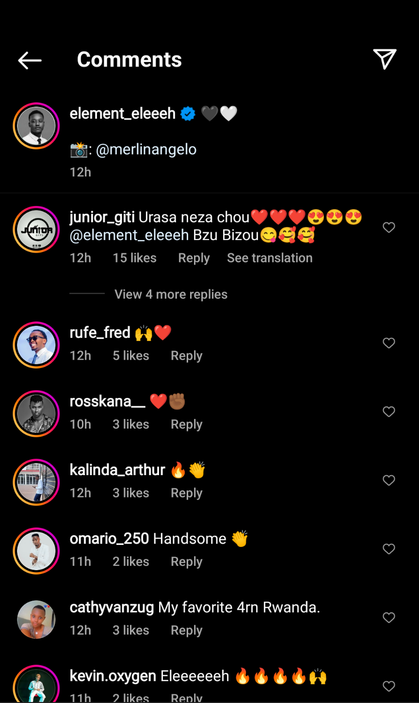 Umusobanuzi wa filime ukunzwe cyane hano mu Rwanda Junior Giti yagize ati :”Urasa neza Chou Element Bzu Bizou” aya magambo yaherekejwe n’ibimenyetso by’umutima bigaragaza urukundo.