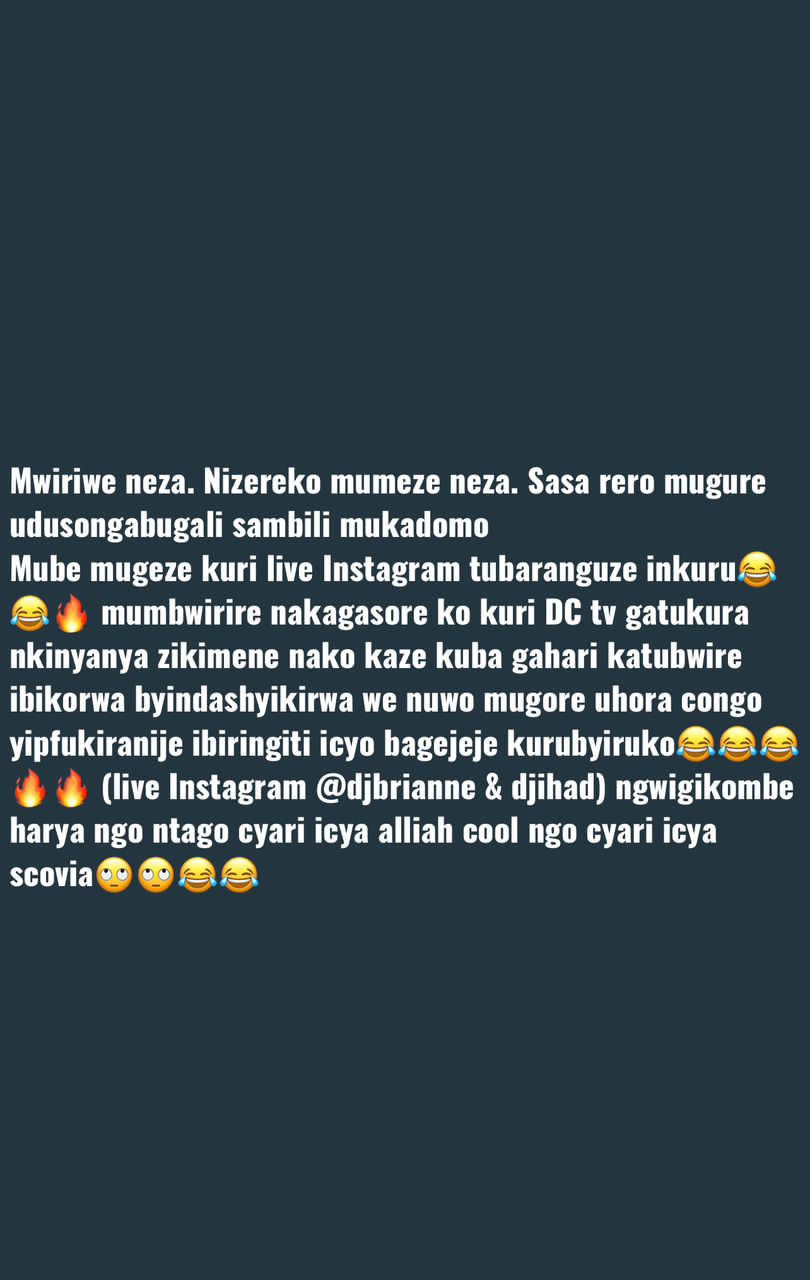 Ni bumwe mu butumwa burimo amagambo mabi Dj Brianne yanyujije ku mbuga nkoranyambaga ze ari nako yateguzaga live kuri Instagram ye.