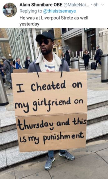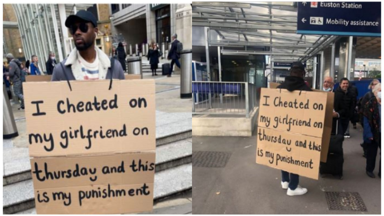 Umugabo utatangajwe amazina yagaragaye azenguruka mu mihanda ya Londres yambaye ikarito mu ijosi yanditseho amagambo agira iti: “Naciye inyuma umukunzi wanjye kandi iki nicyo gihano cyanjye”.
