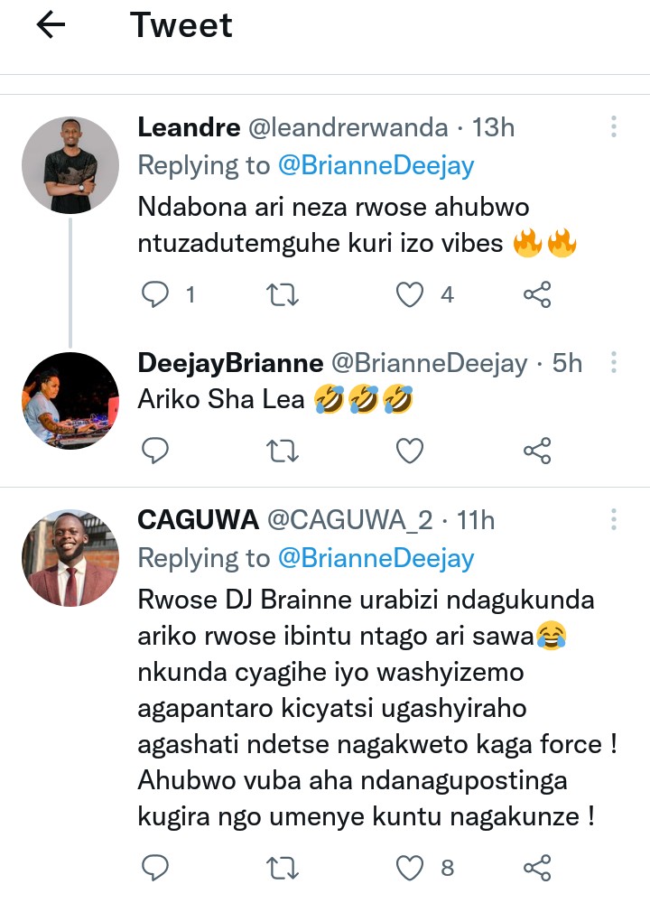 Abinyujije ku rukuta rwa Twitter, Dj Brianne yashyizeho ifoto ye yambaye ikanzu imwegereye yanateze igitaramo mu mutwe maze agira ati “Muzi gusa ibyo natumye mumenya. Ndi mugari Bruh. Ni gute ngaragara sasa?