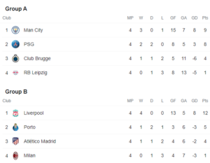 Kuri uyu wa gatatu, ikipe ya Manchester City mu itsinda rya A yatsinze Club Brugge ibitego 4-1 bya Phil Foden, Riyadh Mahrez, Raheem Sterling na Gabriel Jesus. Muri uyu mukino myugariro wa Manchester City w’umunya Portugal Joao Cancelo yatanze imipira itatu ivamo ibitego. Muri iri tsinda ikipe ya Paris St Germain yanganyirije na Leipzig kwa Leipzig ibitego 2-2. Ikipe ya PSG itari ifite kizigenza wayo Lionel Messi yatsindiwe ibyo bitego byombi na Wijnaldum mu gihe ikipe ya Leipzig yatsindiwe n’umufaransa Christopher Nkuku n’umunya hongiriya Szoboszlai.
